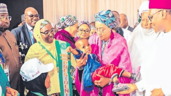 Fig 2. This is the MWAN National President, Dr Zainab Kwaru Muhammad-Idris and the First Lady of Nigeria, her excellency Senator Remi Tinubu during the Measles Rubella Vaccine flag off ceremony in State House Banquet Hall, Abuja.
